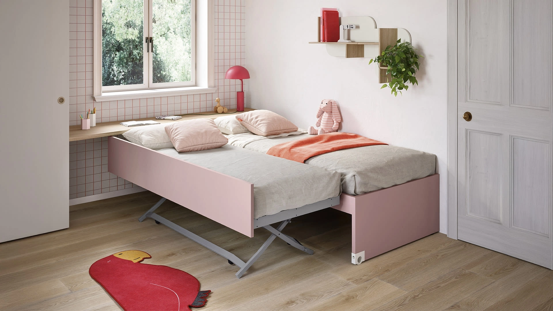 Nidi mette a disposizione una ricca gamma di elementi accessori da abbinare su misura: troverai letto, armadio o cabina armadio, tavolo da lavoro, sedie e librerie. Questa soluzione in melaminico ultima alla perfezione le doti pratiche e il valore estetico della camaretta, in quanto è capace di abbinare ergonomia e sicurezza. Nell'arredamento della stanza dei bambini affidati a noi: in negozio proponiamo tutte le più belle composizioni arredative moderne per la loro camera. Se cerchi idee creative per organizzare alla perfezione la stanza dei tuoi bambini, ti proponiamo la Cameretta Salvaspazio con Letti Estraibili di Nidi con finitura in melaminico.