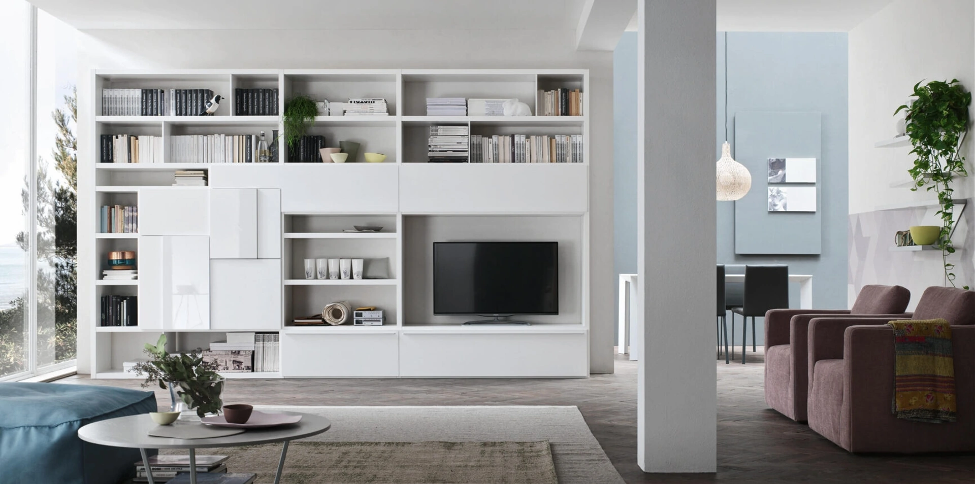 I mobili soggiorno in laccato opaco dalle linee moderne come il modello in foto sono davvero poliedrici e capaci di arredare il living sfruttando bene ogni angolo. La Parete Attrezzata Sistema Spalla Comp SA2214 di Maronese in foto è una delle più originali soluzioni d’arredo in commercio: componibilità personalizzabile e le diverse opportunità di progettazione la rendono pratica e sofisticata. Maronese propone originali modelli di mobili soggiorno, diversi per stile e conformazioni, finiture e elementi: scopri nel nostro punto vendita l'Arredamento Casa delle migliori marche. Dato che il soggiorno deve essere uno spazio ben organizzato e bello a vedersi, sono molto utili alcuni mobili belli e pratici come le Pareti Attrezzate.