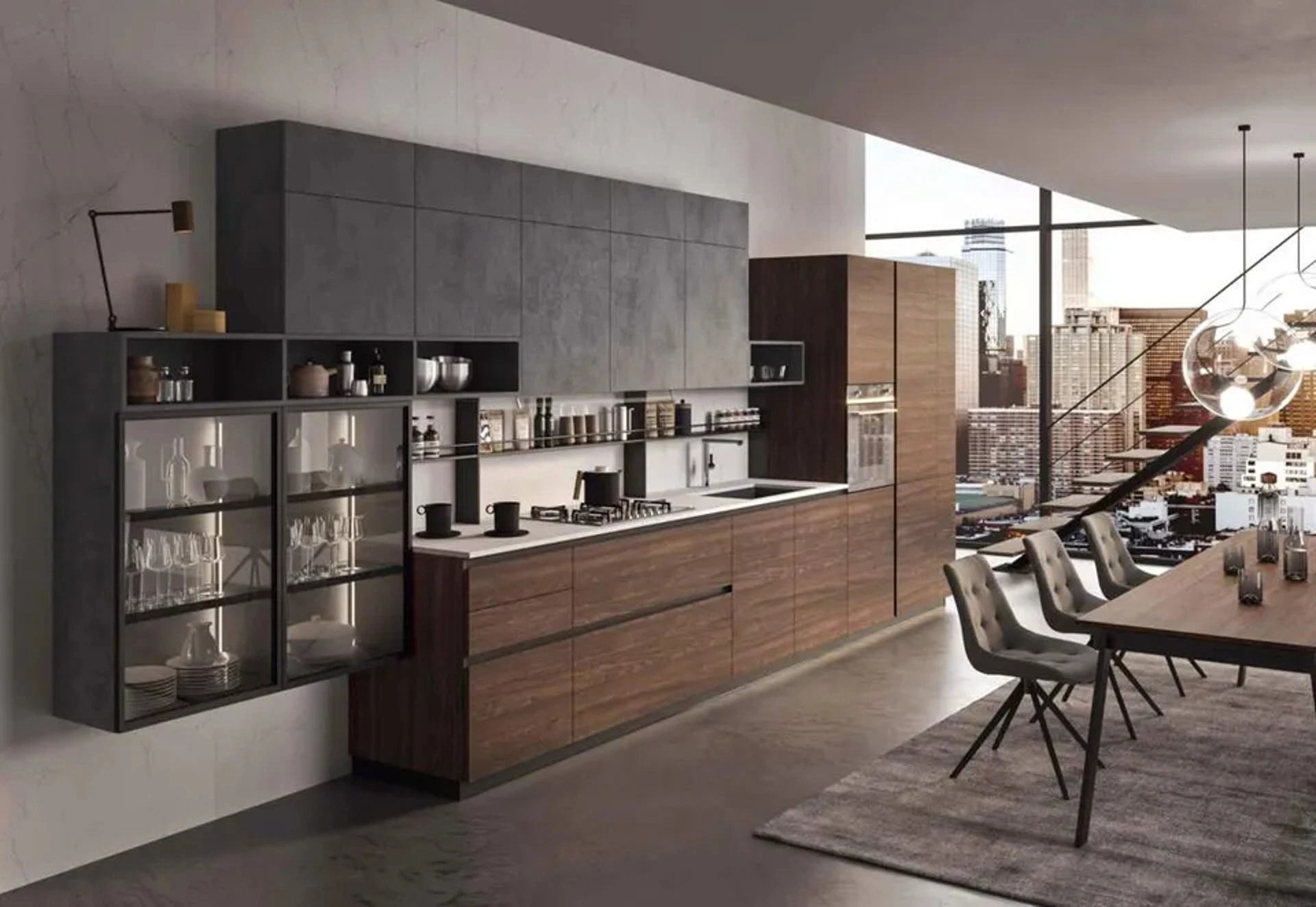 Il modello in melaminico nell'immagine, si può progettare in molteplici disposizioni, cromie e finiture di forte impatto decorativo per lasciarti interpretare l'ambiente con razionalità, garantendoti la praticità e contenitività di cui necessiti. Scegli la cucina che fa al caso tuo tra le differenti soluzioni in linea disponibili in commercio: potrai ammobiliare gli spazi arricchendone l'estetica. Se sei un appassionato di composizioni moderne e non rinunci alla qualità assicurata dal noto e conosciuto marchio, allora il nostro showroom è il luogo ideale.